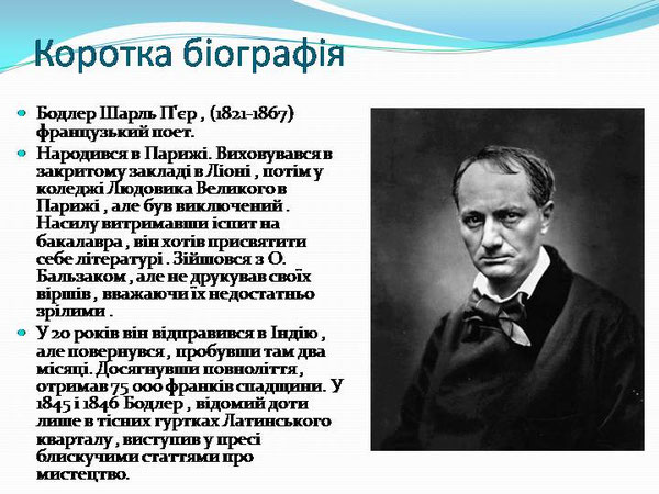 Шарль Бодлер- пізній романтик і зачинатель модернізму. Збірка "Квіти зла". Сонет " Альбатрос"