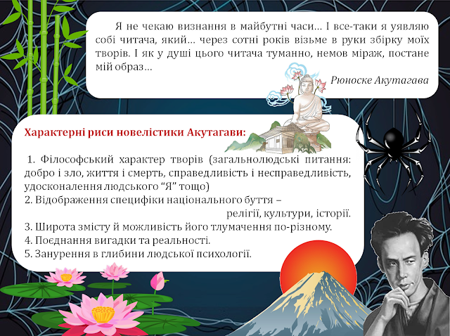 Майстер японської новели Рюноске Акутагава. Утілення ідеї про моральну справедливість у новелі "Павутинка". Філософський зміст твору. Підтекст. Художні образи новели (Будда, Кандата)